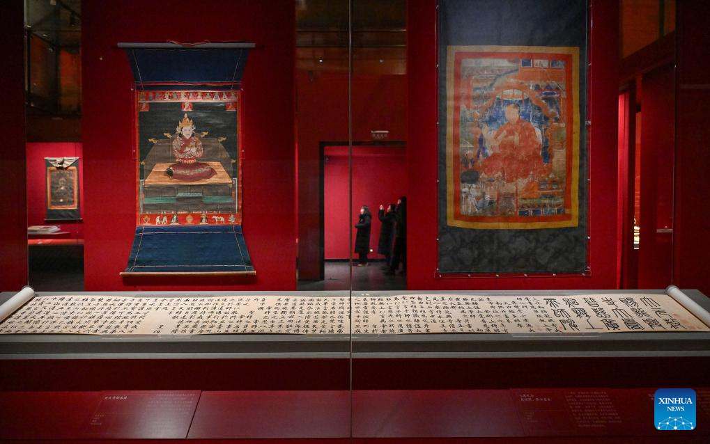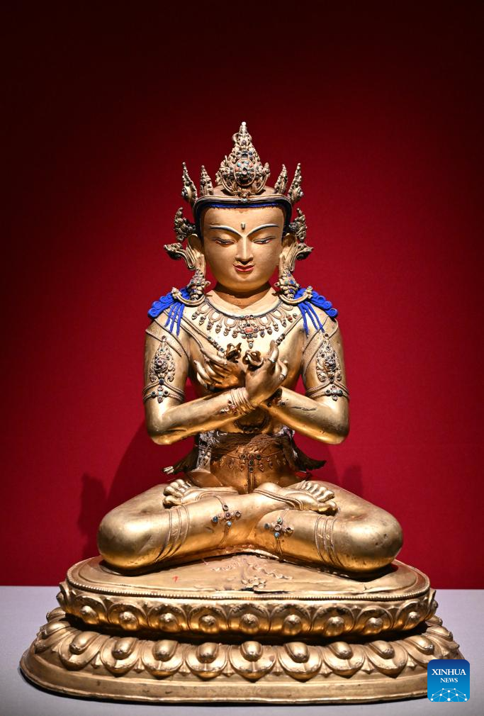 An exhibit is pictured during a preview of the exhibition "Beyond Time: the history, culture and art of Sakya Monastery" at the Palace Museum in Beijing, capital of China, Feb. 9, 2026. The exhibition, which will last till May 10, showcases over 200 relics reflecting the history, culture and art of Sakya Monastery, the earliest monastery of the Sakya Sect of the Tibetan Buddhism. (Xinhua/Li Xin)