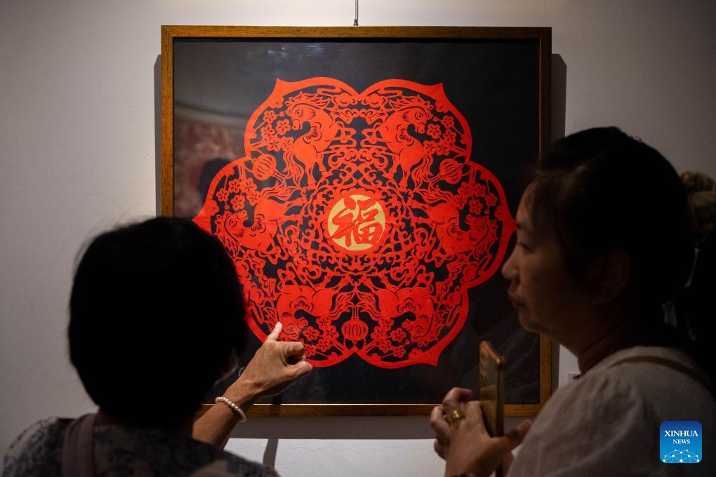 People appreciate a paper-cutting artwork of the Year of the Horse in Selangor state, Malaysia, Feb. 5, 2026. As the Spring Festival approaches, traditional Chinese art of paper-cutting featuring the Year of the Horse increased the festive atmosphere in Malaysia. (Photo by Chong Voon Chung/Xinhua)