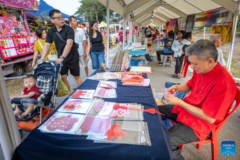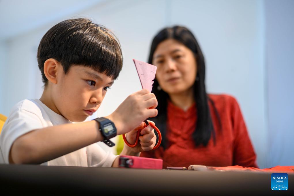 A child tries paper-cutting in Kuala Lumpur, Malaysia, Feb. 7, 2026. As the Spring Festival approaches, traditional Chinese art of paper-cutting featuring the Year of the Horse increased the festive atmosphere in Malaysia. (Photo by Chong Voon Chung/Xinhua)