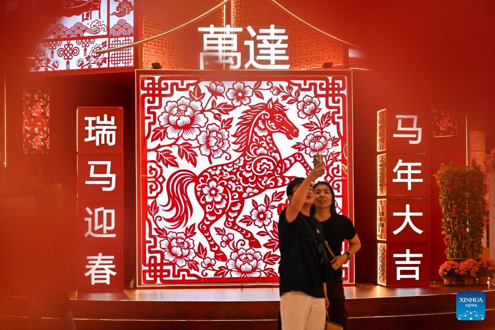 People take a selfie in front of a horse decoration for the upcoming Chinese New Year at a mall in Kuala Lumpur, Malaysia, Jan. 30, 2026. As the Spring Festival approaches, traditional Chinese art of paper-cutting featuring the Year of the Horse increased the festive atmosphere in Malaysia. (Photo by Chong Voon Chung/Xinhua)