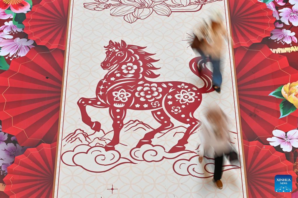 This photo taken on Jan. 30, 2026 shows a horse decoration for the upcoming Chinese New Year at a mall in Kuala Lumpur, Malaysia. As the Spring Festival approaches, traditional Chinese art of paper-cutting featuring the Year of the Horse increased the festive atmosphere in Malaysia. (Photo by Chong Voon Chung/Xinhua)