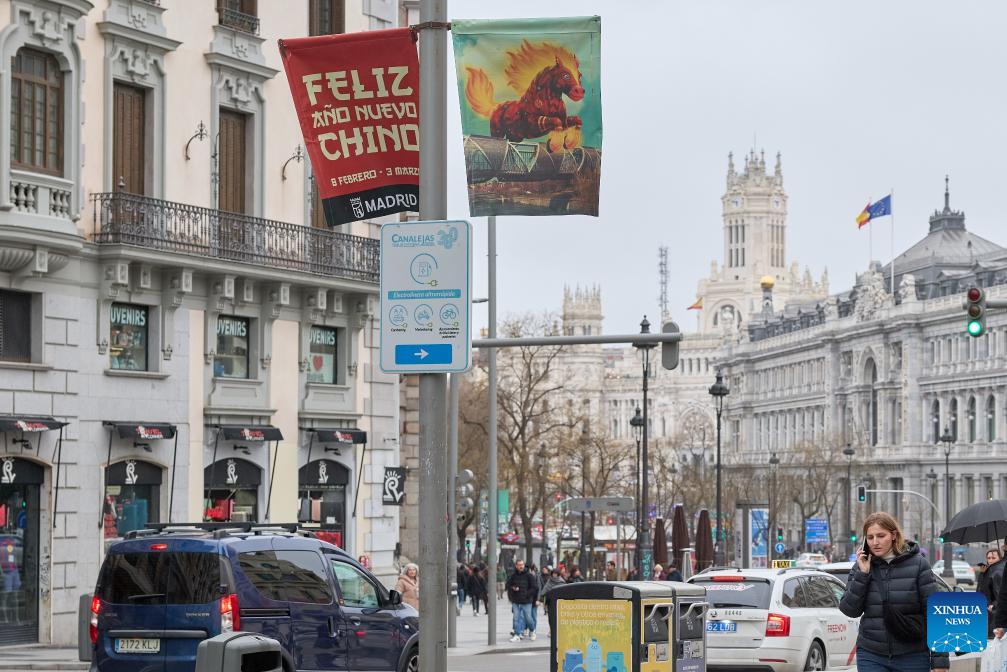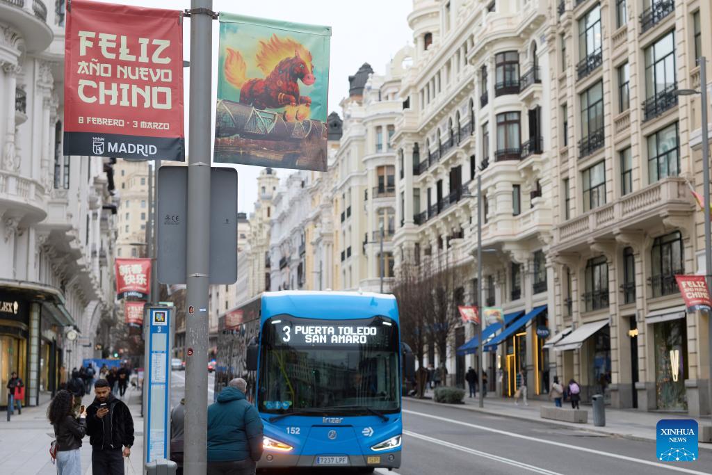 A poster themed on the Chinese New Year is seen in Madrid, Spain, on Feb. 11, 2026. (Xinhua/Meng Dingbo)