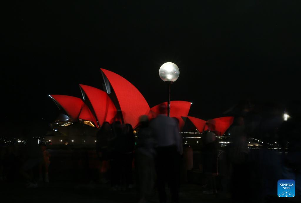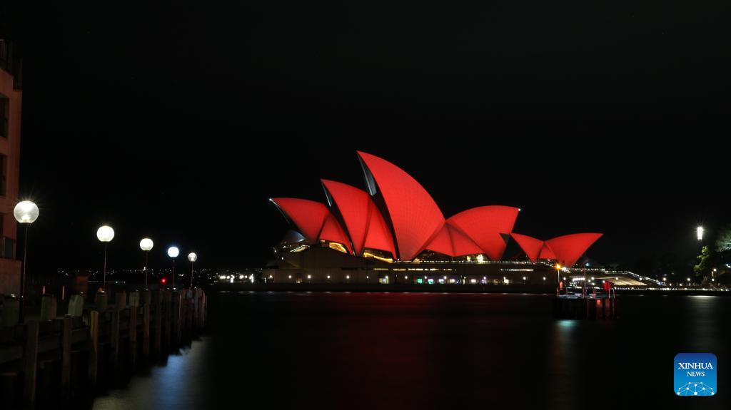This photo taken on Feb. 12, 2026 shows the Opera House lit up in red to celebrate the upcoming Chinese New Year in Sydney, Australia. (Xinhua/Ma Ping)