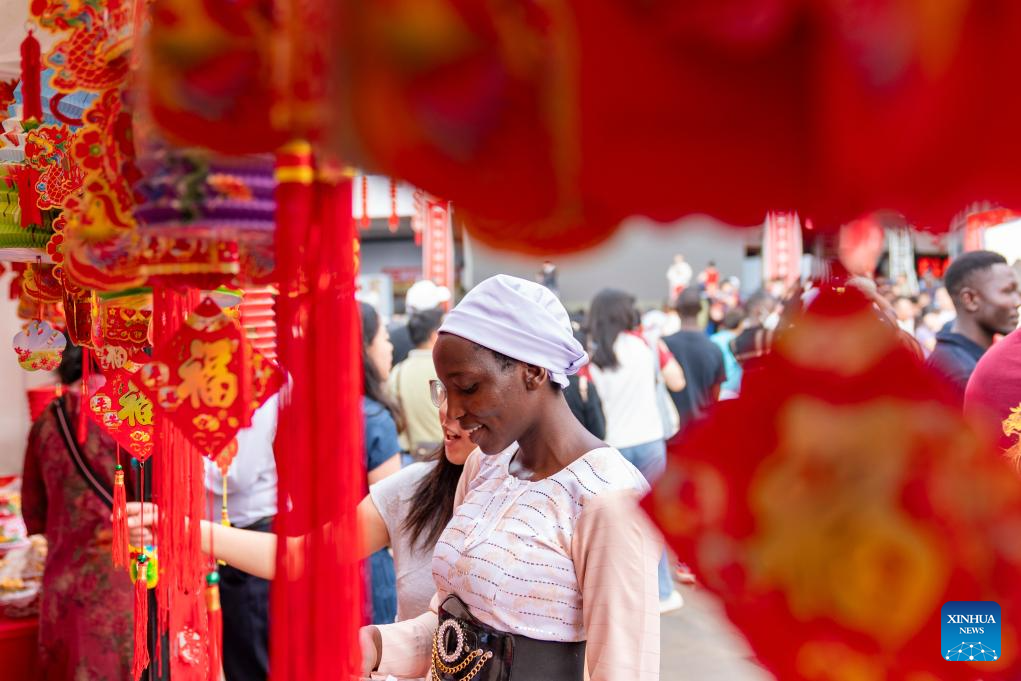 People look at Chinese New Year decorations at the 2026 Chinese New Year Gala in Nairobi, Kenya, February 8, 2026.