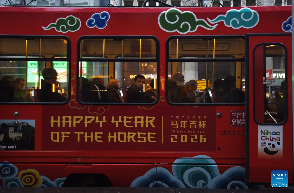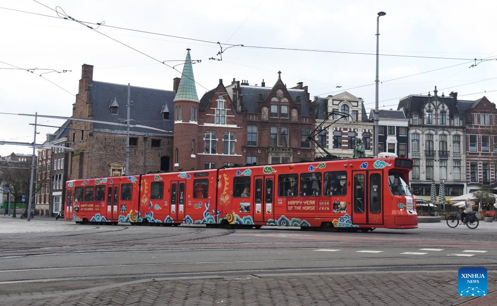 A tram decorated to celebrate the upcoming Chinese New Year is pictured in The Hague, the Netherlands, on Feb. 13, 2026. The tram has debuted on the busiest urban tram line in The Hague, bringing the festive spirit of the Chinese New Year to local residents. (Xinhua/Shao Haijun)