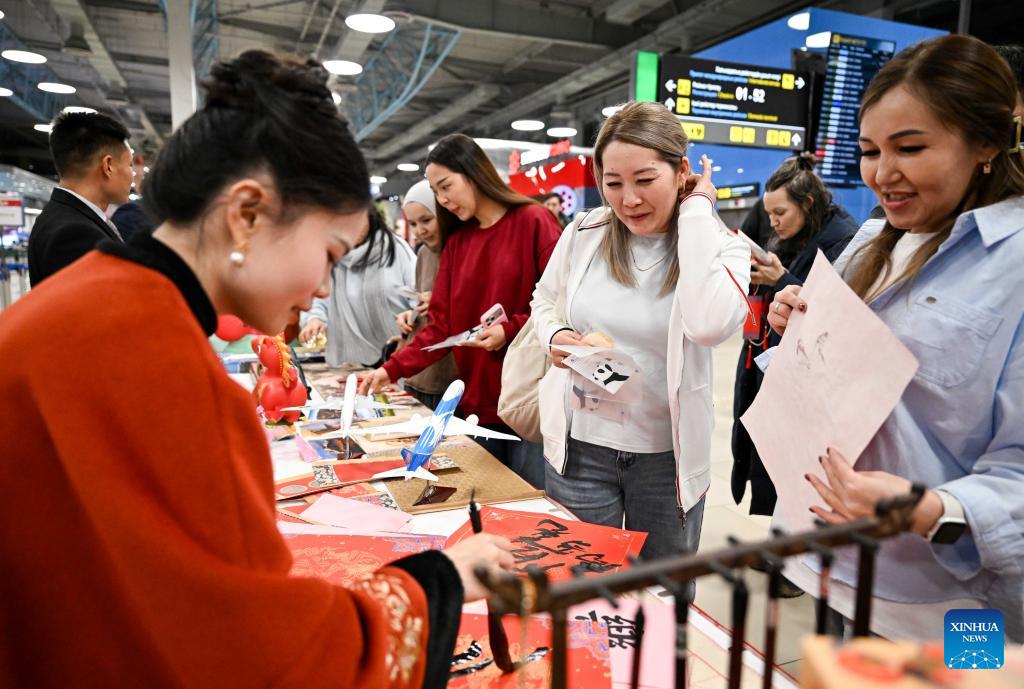 Passengers take part in a Chinese New Year cultural event at the Almaty International Airport in Almaty, Kazakhstan, Feb. 13, 2026. (Xinhua/Li Renzi)
