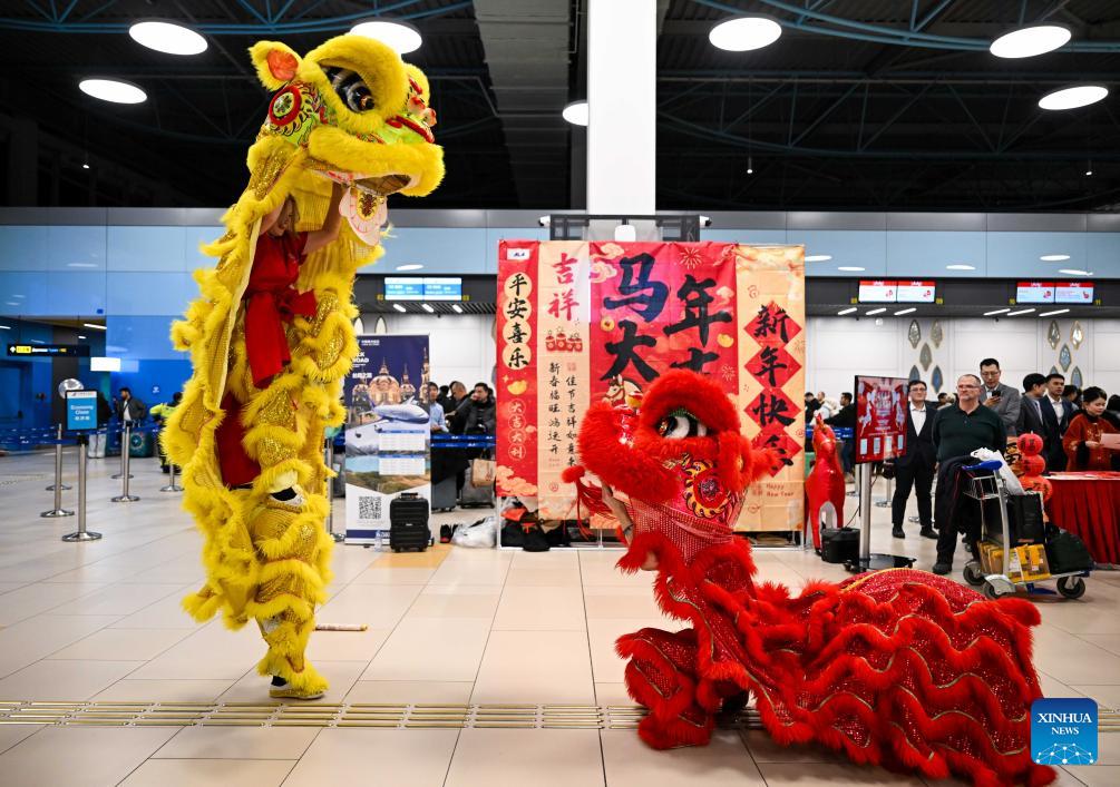 A lion dance performance is staged during a Chinese New Year cultural event at the Almaty International Airport in Almaty, Kazakhstan, Feb. 13, 2026. (Xinhua/Li Renzi)