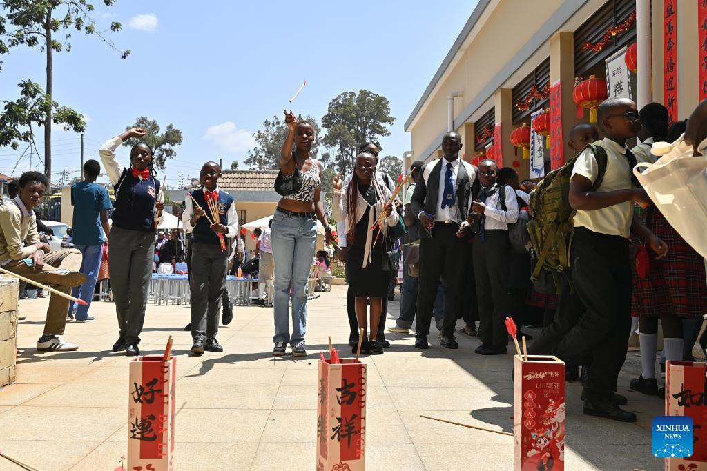 Locals try their luck with touhu, a traditional Chinese game also known as pitch-pot, during an event to mark the upcoming Chinese New Year in Nairobi, Kenya, Feb. 12, 2026. Celebrations showcasing Chinese costumes, cuisine and arts were held here on Thursday in celebration of the most important traditional Chinese festival. (Xinhua/Liu Qiong)