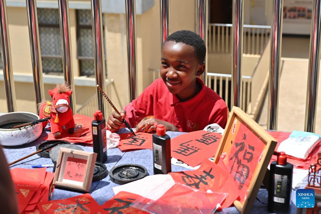 A boy tries Chinese calligraphy during an event to mark the upcoming Chinese New Year in Nairobi, Kenya, Feb. 12, 2026. Celebrations showcasing Chinese costumes, cuisine and arts were held here on Thursday in celebration of the most important traditional Chinese festival. (Xinhua/Liu Qiong)