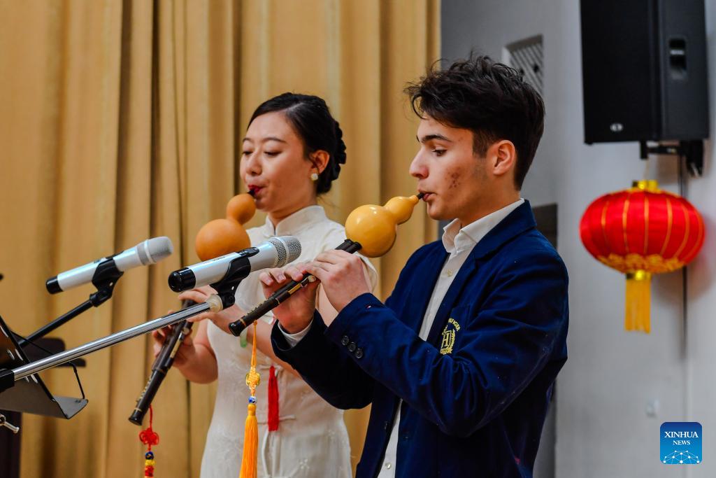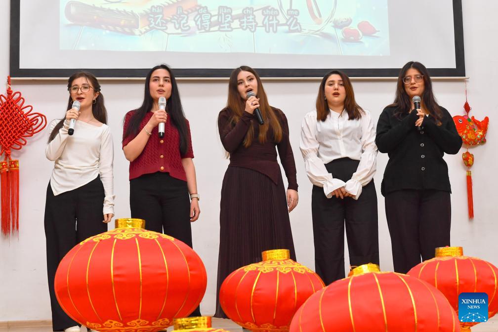 Azerbaijani students perform during an event to celebrate the upcoming Chinese New Year at the Confucius Institute in Azerbaijan University of Languages in Baku, Azerbaijan, Feb. 13, 2026. (Xinhua/Chen Junfeng)