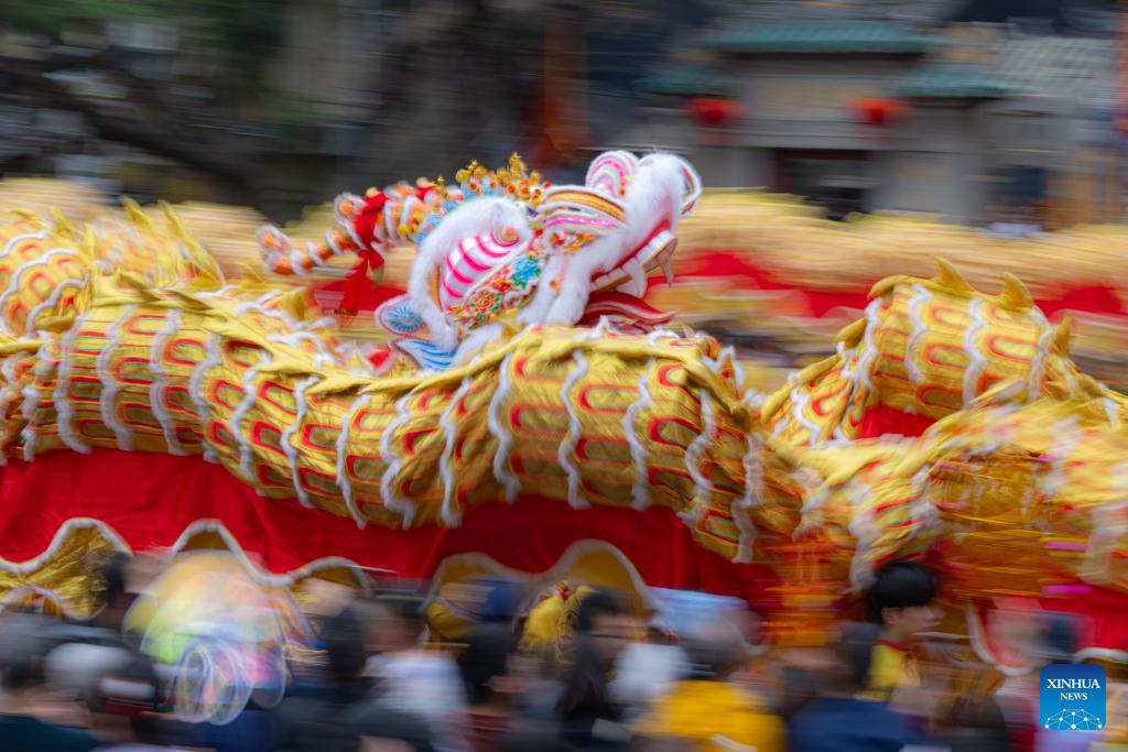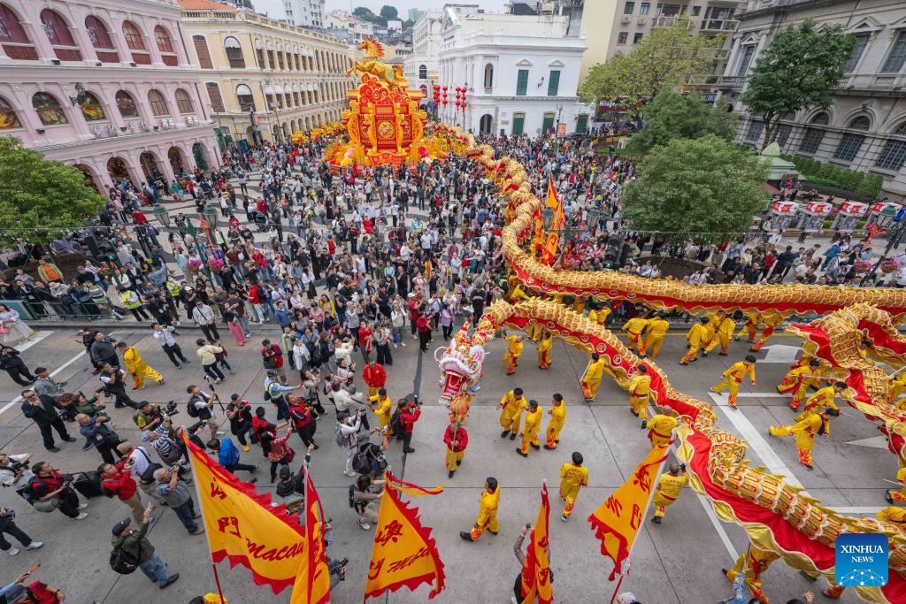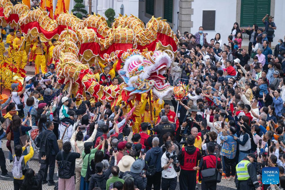Artists perform dragon dance in celebration of the Spring Festival in Macao, south China, Feb. 17, 2026. (Xinhua/Cheong Kam Ka)