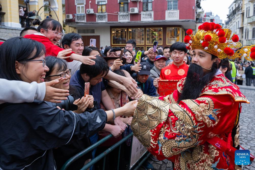A man dressed as the God of Fortune interacts with visitors during a celebration of the Spring Festival in Macao, south China, Feb. 17, 2026. (Xinhua/Cheong Kam Ka)