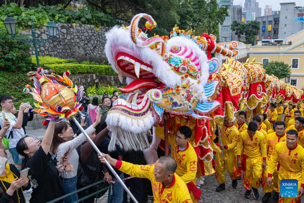 Artists performing dragon dance interact with visitors in celebration of the Spring Festival in Macao, south China, Feb. 17, 2026. (Xinhua/Cheong Kam Ka)