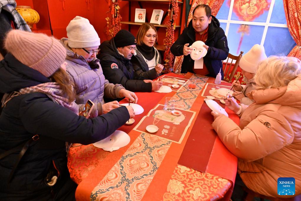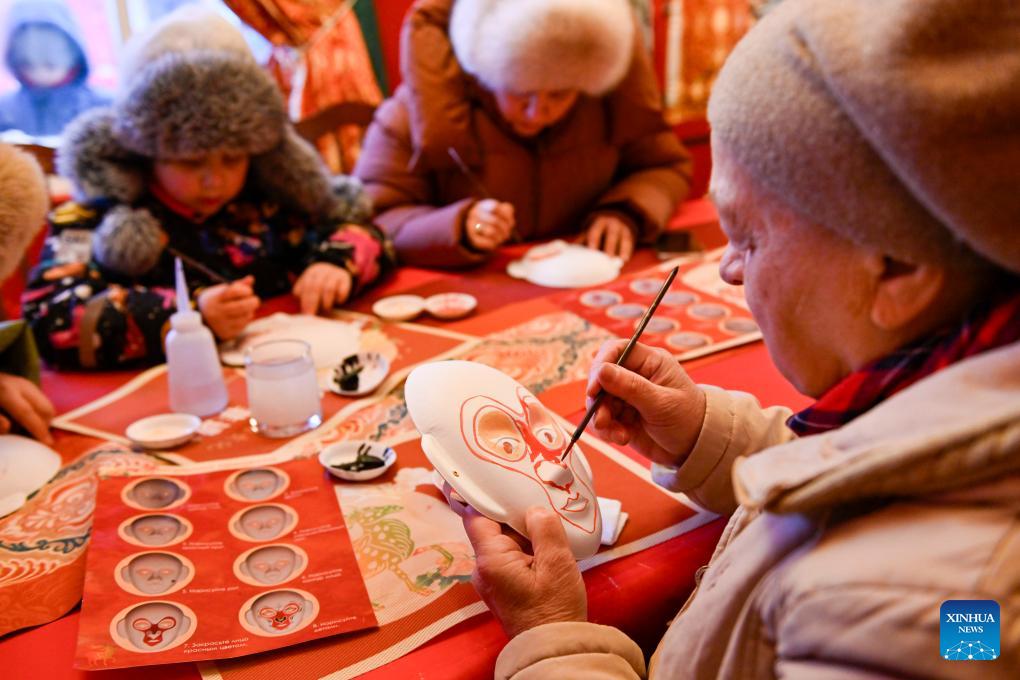 People take part in a class on painting Peking Opera facial masks as a part of celebration of the Chinese Lunar New Year in Moscow, Russia, Feb. 17, 2026. (Photo by Alexander Zemlianichenko Jr/Xinhua)
