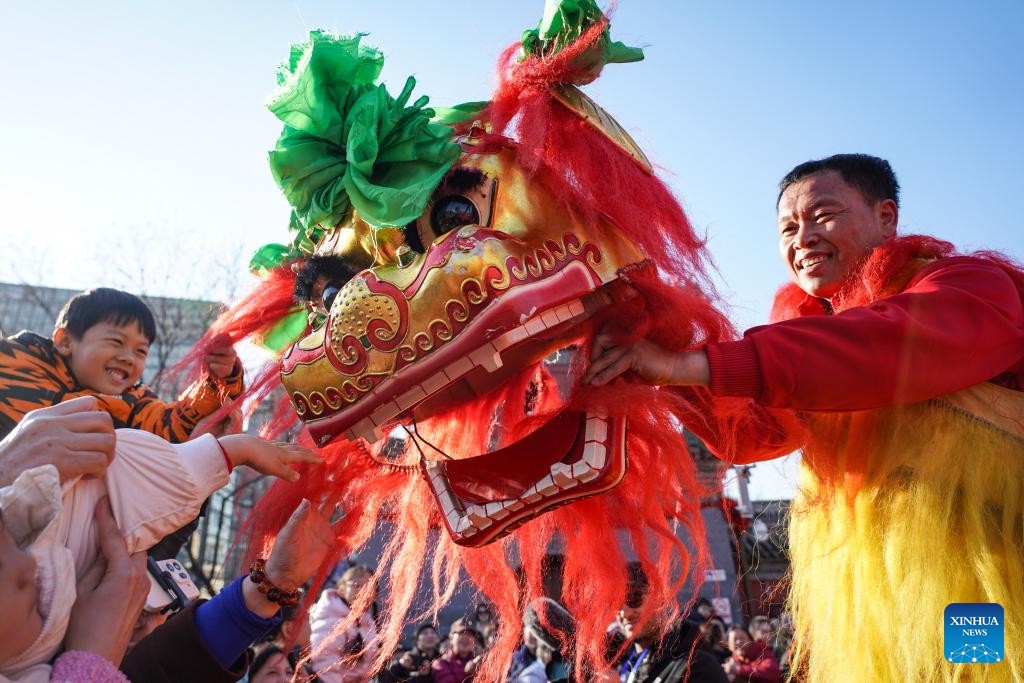 People interact with lion dance performers at a temple fair in Beijing, capital of China, Feb. 17, 2026. Temple fairs opened here celebrating the Spring Festival and presenting visitors with traditional dances, lion dances and delicious food. (Xinhua/Chen Zhonghao)