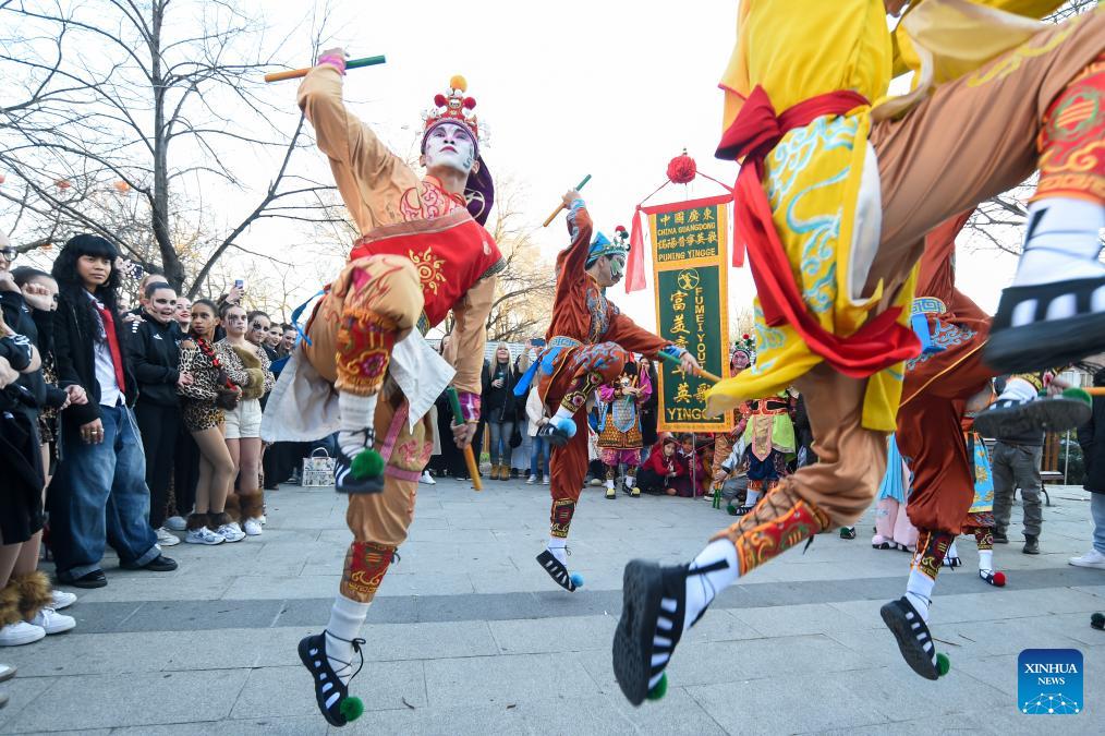 Yingge dancers from Guangdong Jieyang perform during a Spring Festival temple fair event in Madrid, Spain, Feb. 20, 2026. (Photo by Gustavo Valiente/Xinhua)