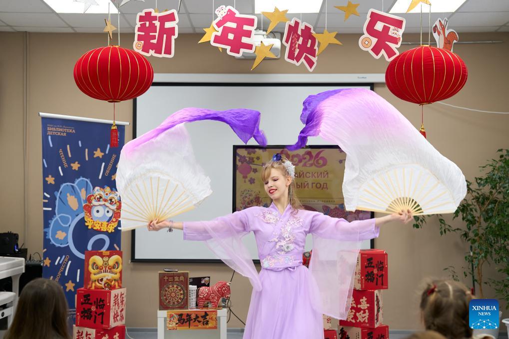A girl performs a traditional Chinese fan dance during an event at a library in St. Petersburg, Russia, Feb. 28, 2026. The event entitled "Traditional Chinese Culture in the Community" was hosted here on Saturday, where a local sinologist talked about culture and customs related to the Chinese Spring Festival. (Photo by Guo Feizhou /Xinhua)