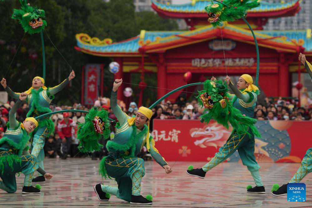 Folk artists perform in celebration of upcoming Lantern Festival in China's Zhejiang