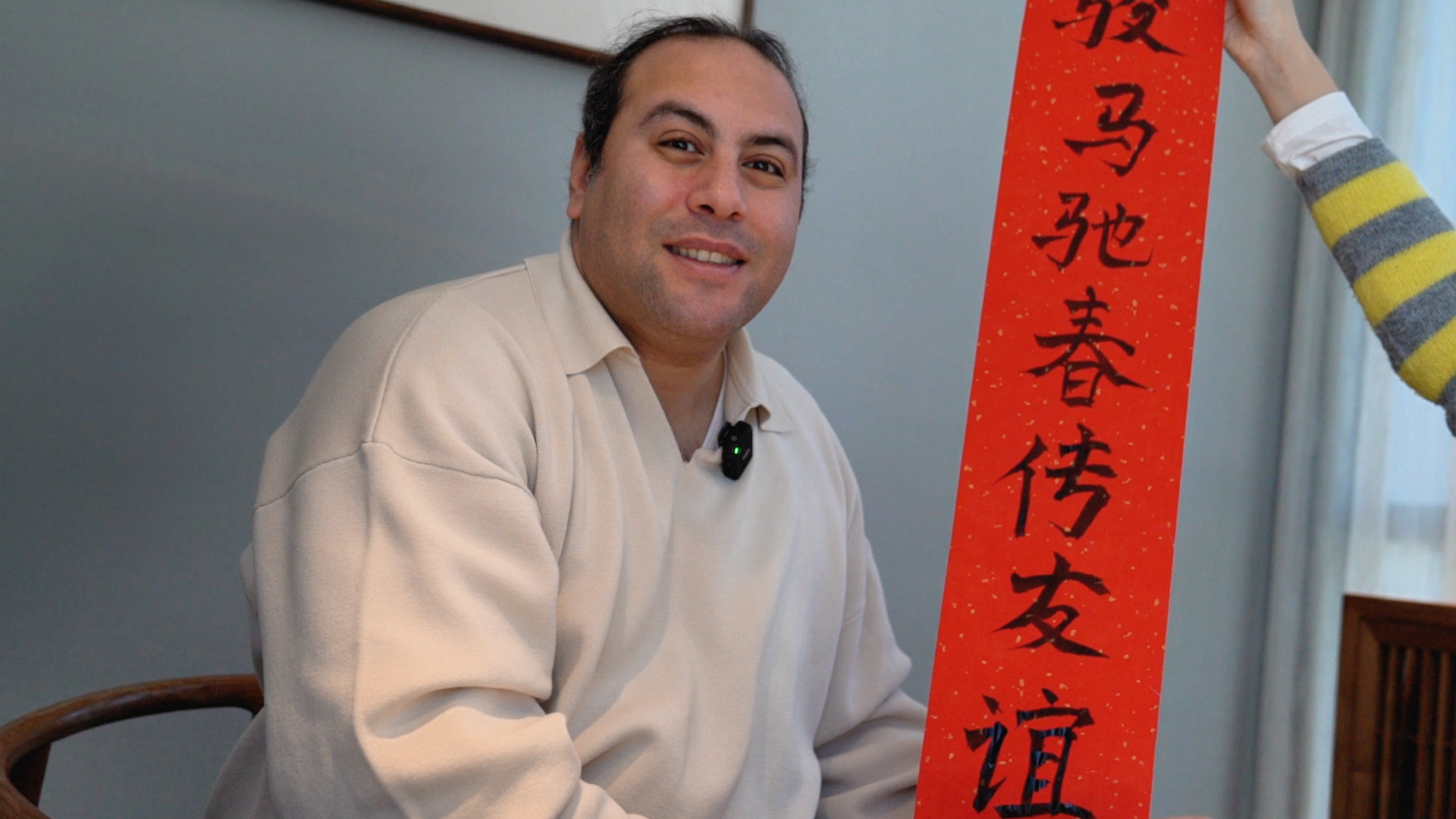 Alaa Mamdouh Akef displays a Spring Festival couplet. (People's Daily Online/Wang Yuheng)