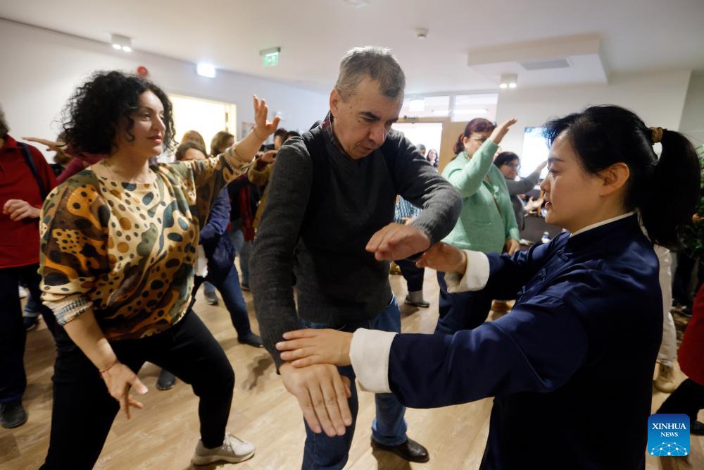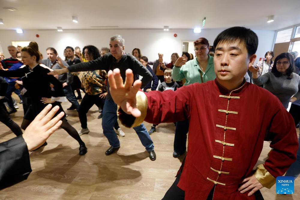 Romanians practice Taijiquan, a kind of Chinese traditional martial arts, with a Chinese master during an International Taijiquan Day event at the Chinese Cultural Center in Bucharest, Romania, March 20, 2026. A lecture ahead of the first International Taijiquan Day was held on Friday at the Chinese Cultural Center in Bucharest.