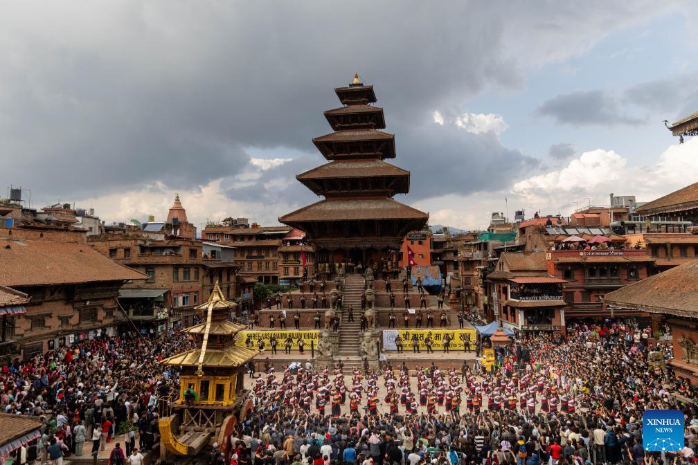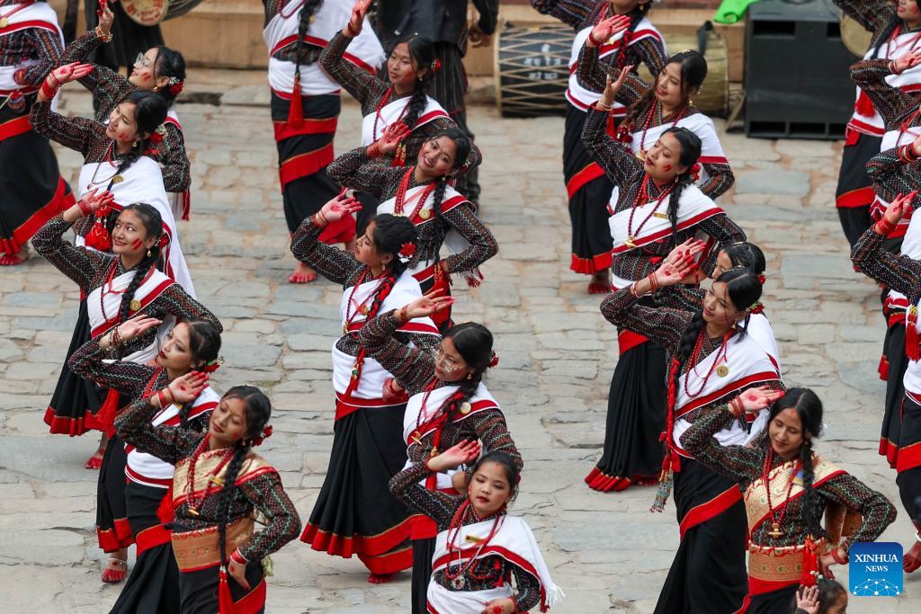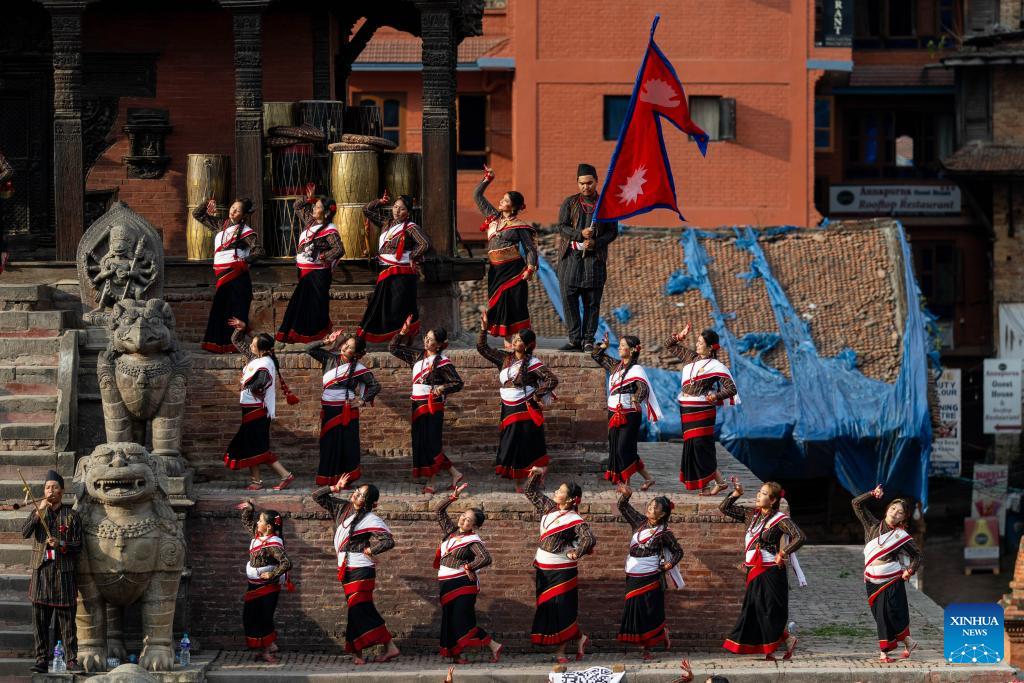 People dressed in traditional attire perform at a musical celebration marking the upcoming Nepali New Year at Bhaktapur Durbar Square in Bhaktapur, Nepal, on April 9, 2026. (Photo by Sulav Shrestha/Xinhua)