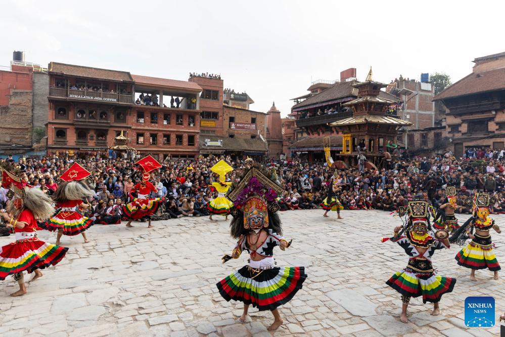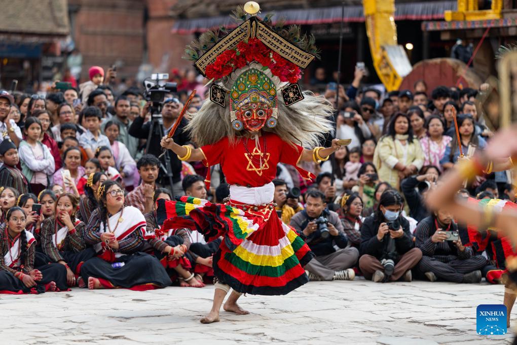 A mask dancer performs at a musical celebration marking the upcoming Nepali New Year at Bhaktapur Durbar Square in Bhaktapur, Nepal, on April 9, 2026. (Photo by Sulav Shrestha/Xinhua)