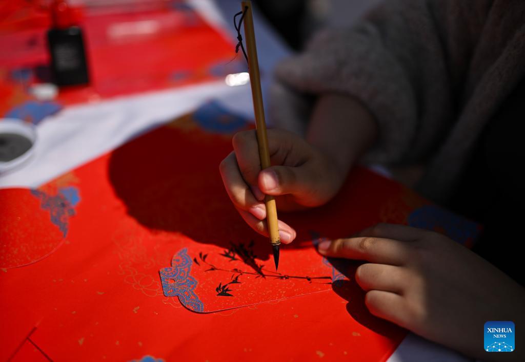 A student learns to make paper cutting at the 2026 International Chinese Language Day event in Almaty, Kazakhstan, April 20, 2026. A celebration event marking the 2026 International Chinese Language Day was held here Monday. (Xinhua/Li Renzi)