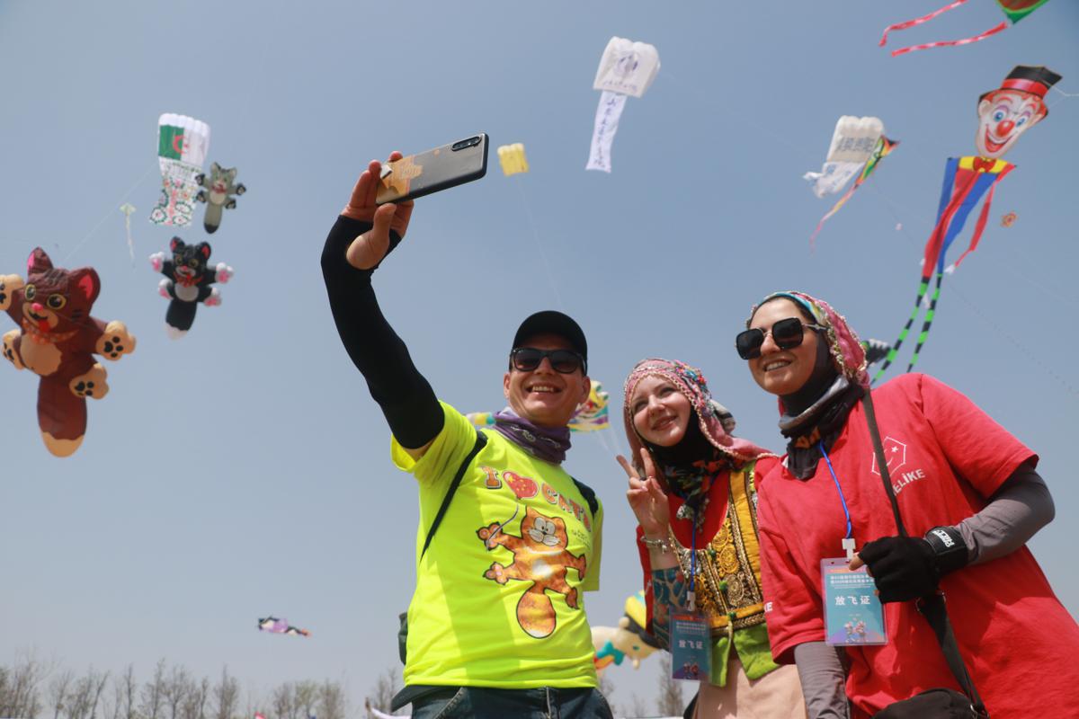 International kite enthusiasts take a selfie during a mass kite-flying event at the 43rd Weifang International Kite Festival in Weifang, Shandong province, on Saturday. (Photo: China Daily)