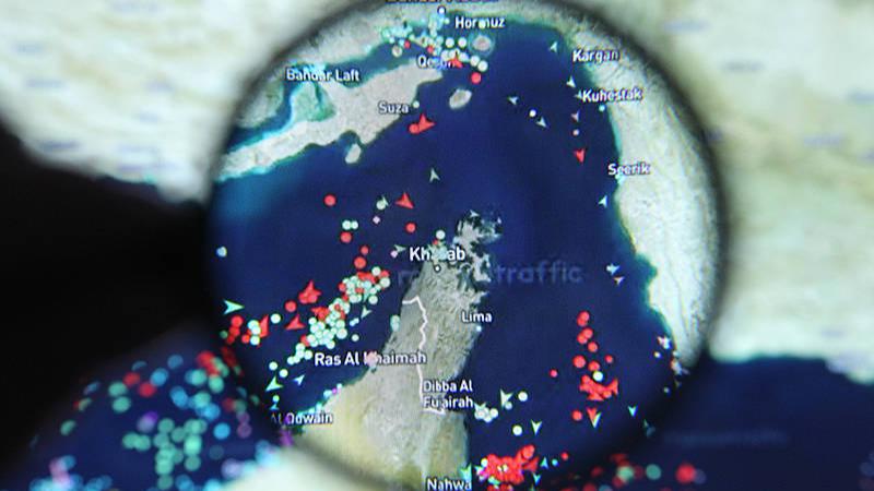 A laptop screen displays a map of the Strait of Hormuz alongside real-time vessel tracking data from Marine Traffic, with a magnifying glass highlighting the strategically vital waterway for oil shipments. (Photo: VCG)