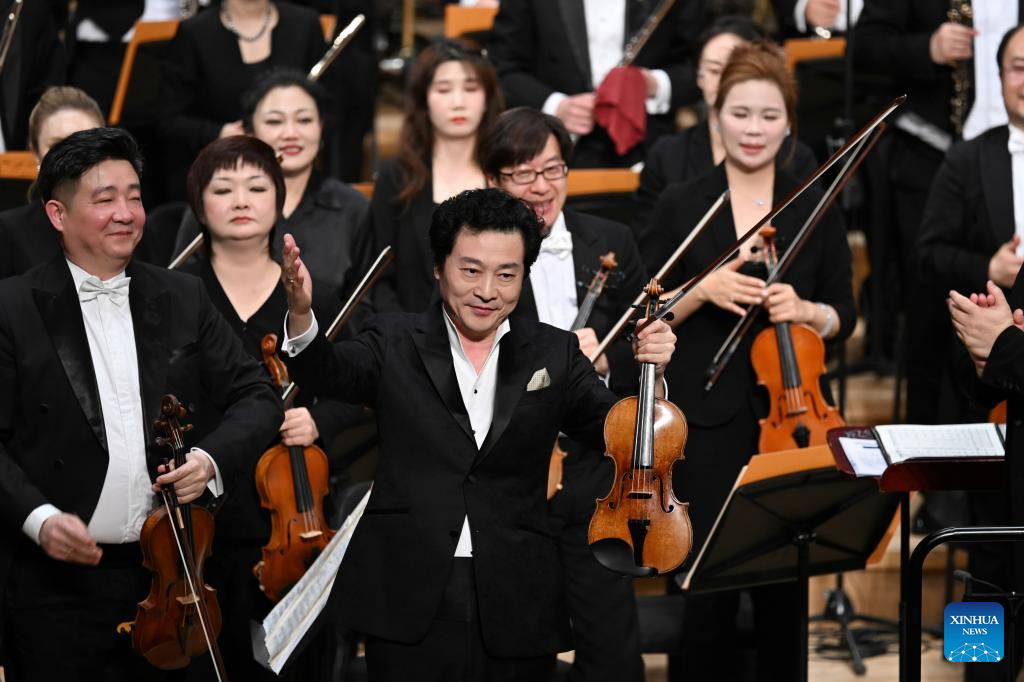 Violinist Lyu Siqing (C) gestures to the audience during the 2026 Tianjin Music Festival at Tianjin Grand Theater in north China's Tianjin, on April 26, 2026. The 2026 Tianjin Music Festival kicked off here on Sunday. Covering theater performances, immersive characteristic performances, and mass public welfare performances, it will present nearly a hundred music events and last until July 5. (Xinhua/Sun Fanyue)