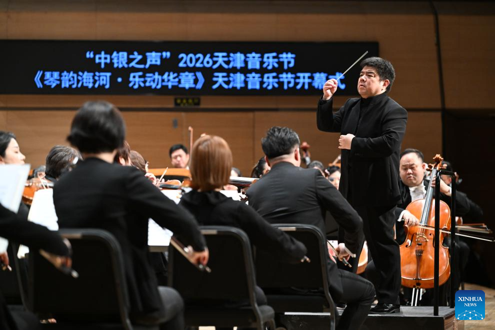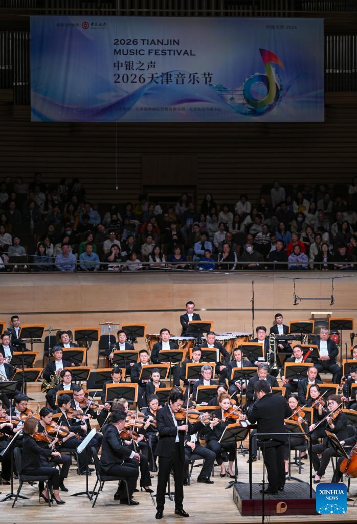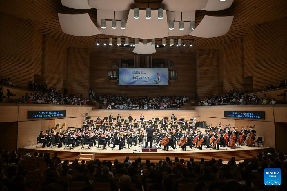 Musicians perform during the opening of the 2026 Tianjin Music Festival at Tianjin Grand Theater in north China's Tianjin, on April 26, 2026. The 2026 Tianjin Music Festival kicked off here on Sunday. Covering theater performances, immersive characteristic performances, and mass public welfare performances, it will present nearly a hundred music events and last until July 5. (Xinhua/Sun Fanyue)