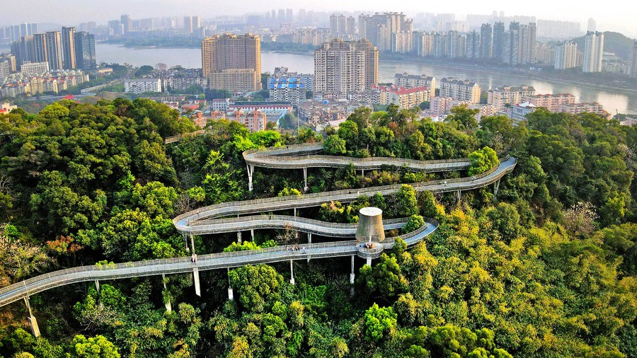 People strolling on a viaduct of Jinjishan Park in Fuzhou, Southeast China's Fujian Province, March 16, 2021. (Photo: Xinhua)