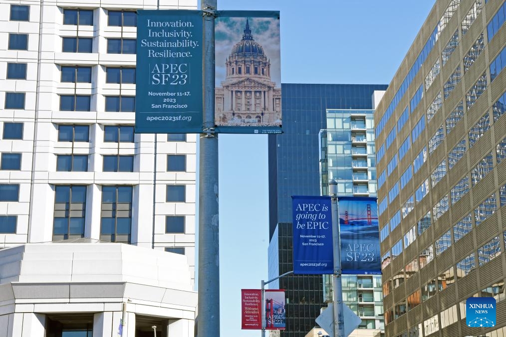 Photo taken on Nov. 12, 2023 shows the APEC 2023 signs in front of the APEC 2023 International Media Center in San Francisco, the United States.