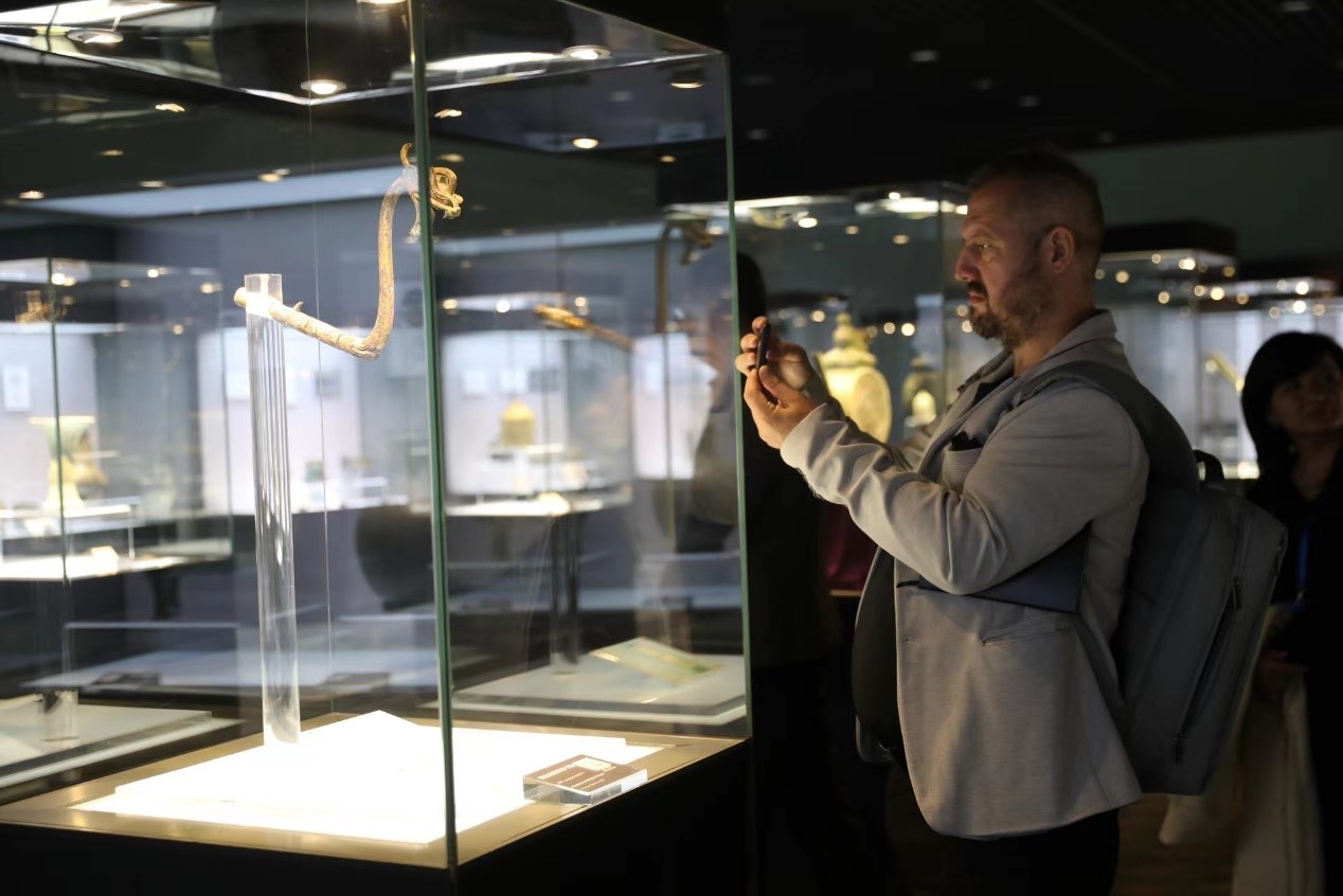 Faruk Borić, executive director of the Center for the Promotion of Belt and Road Initiative in Bosnia and Herzegovina, photographs an artifact. (Photo: Liang Xiaojian)