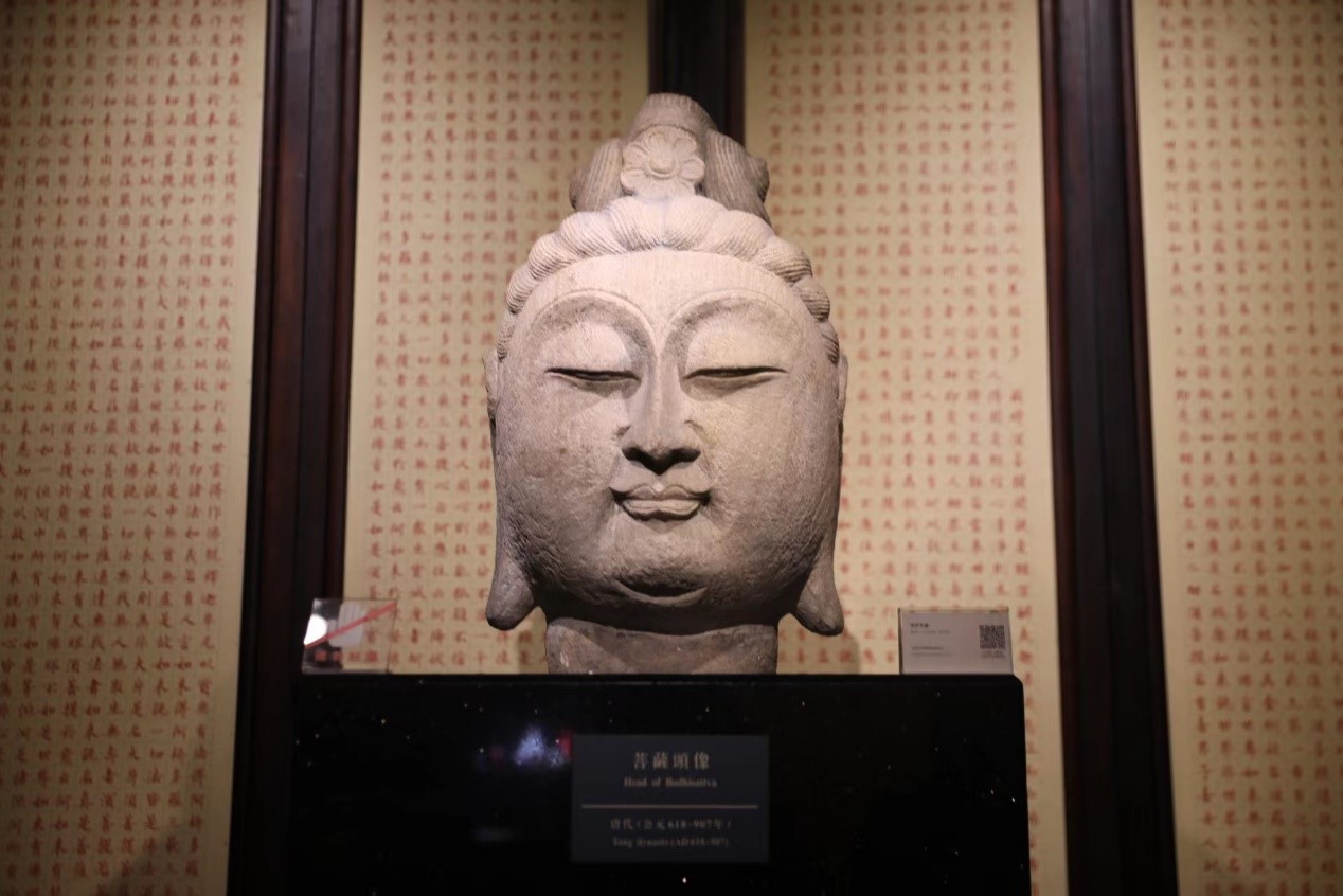 A head of the Bodhisattva made in the Tang Dynasty (618-907) is displayed at the Poly Art Museum. (Photo: Liang Xiaojian)