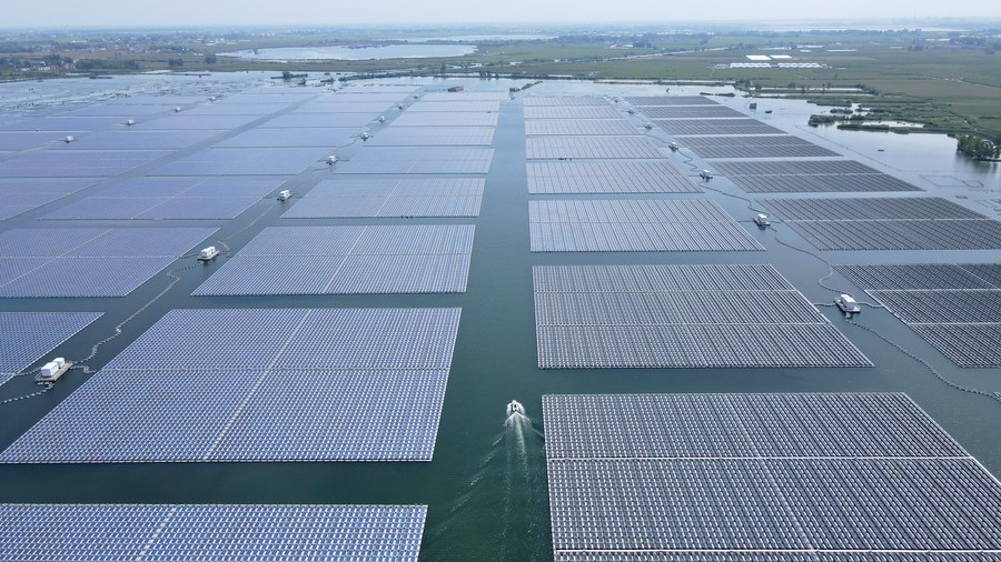 Aerial photo taken on Aug. 25, 2022 shows a view of Maowei floating photovoltaic power station on water in Gucheng Township of Yingshang County, east China's Anhui Province. (Photo: Xinhua)
