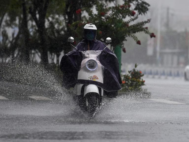 A citizen rides amid heavy rainfall in Beihai City, south China's Guangxi Zhuang Autonomous Region, June 14, 2025.