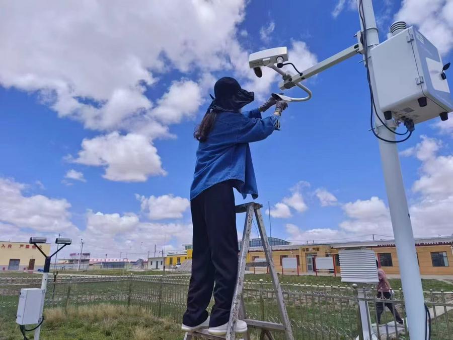 This photo taken with a mobile phone shows a staff member adjusting a meteorological observation device at the Tuotuohe Meteorological Station in Northwest China's Qinghai Province, June 30, 2024. (Photo: Xinhua)