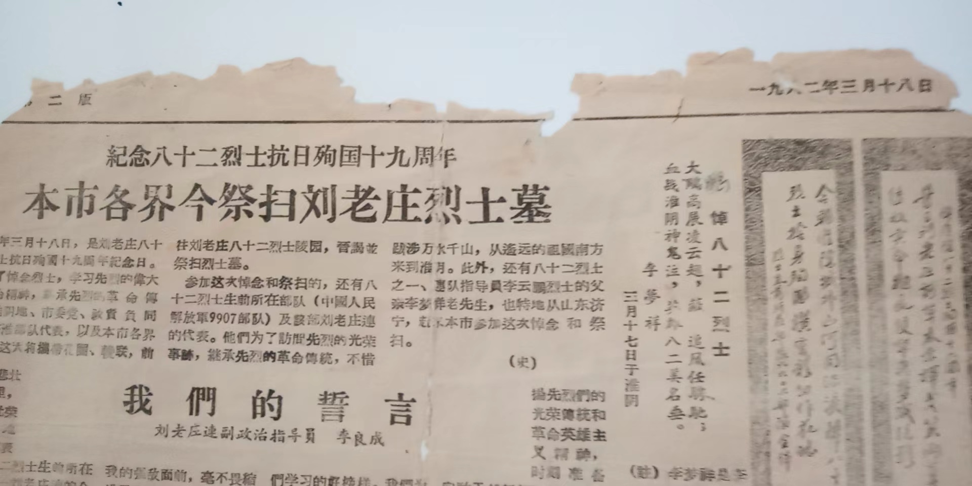 A newspaper clipping from March 18, 1982, commemorating the 40th anniversary of the 82 martyrs of the Liu Laozhuang Company. (File photo)