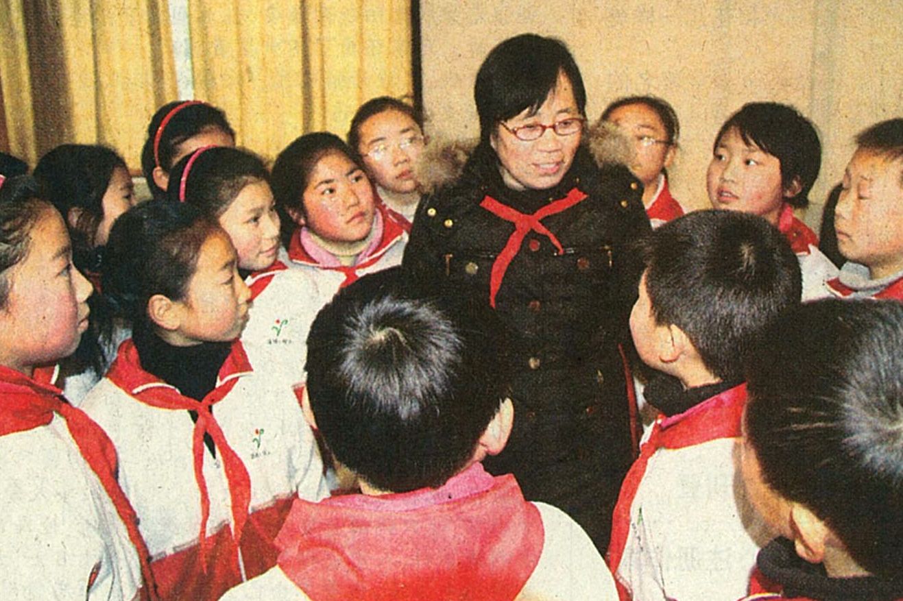 Li Aiyun speaks to a group of Young Pioneers about the heroic story of the 82 martyrs of the Liu Laozhuang Company. (File photo)