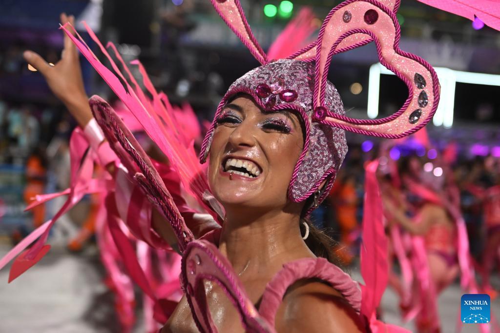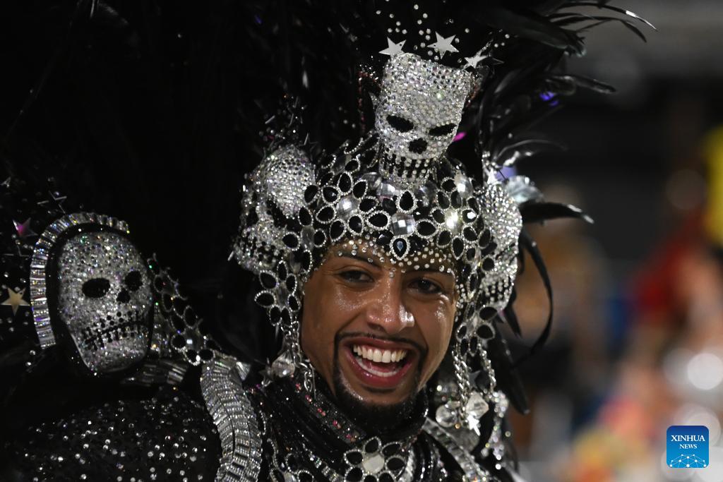 Revellers attend a parade during the Carnival 2026 on the Marques De Sapucai Avenue in Rio de Janeiro, Brazil, Feb. 13, 2026. (Photo by Lucio Tavora/Xinhua)