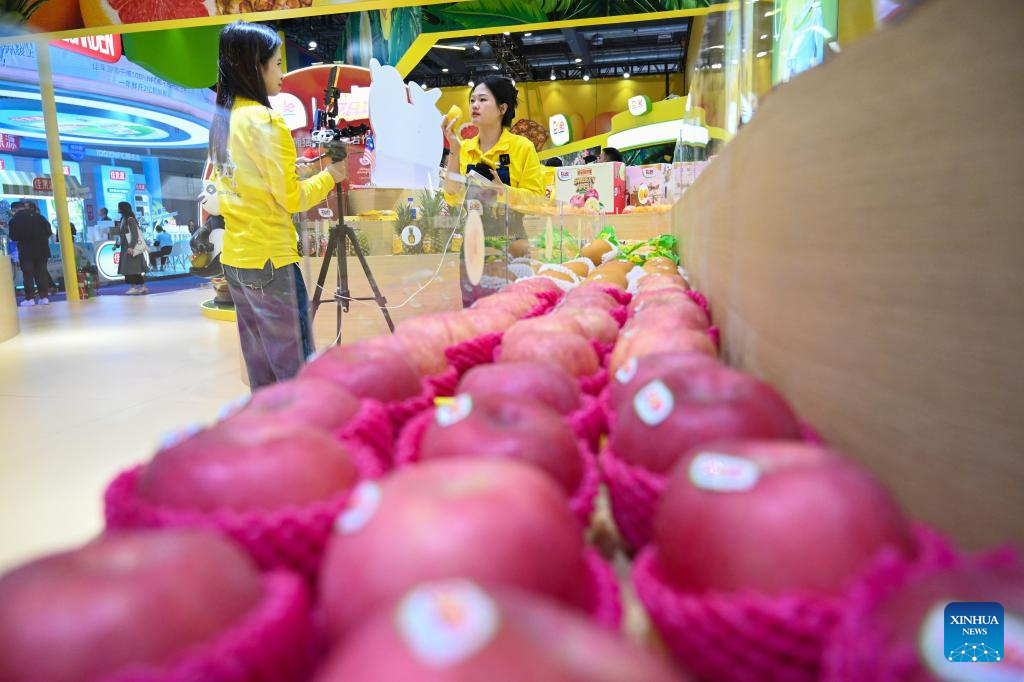 Exhibitors promote fruits via live-streaming during the seventh China International Import Expo (CIIE) in East China's Shanghai, November 6, 2024. (Photo: Xinhua)