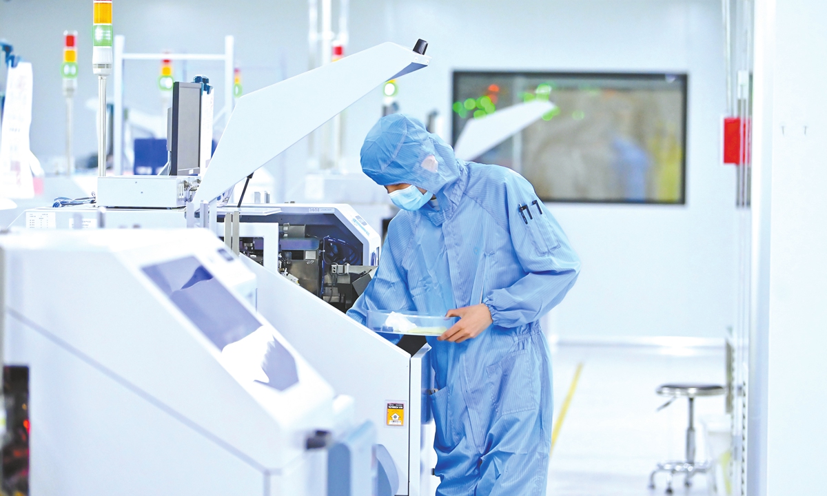A worker operates an automated equipment for chip packaging and testing production in a semiconductor production company in Jiujiang, East China's Jiangxi Province on March 21, 2024. (Photo: CFP)
