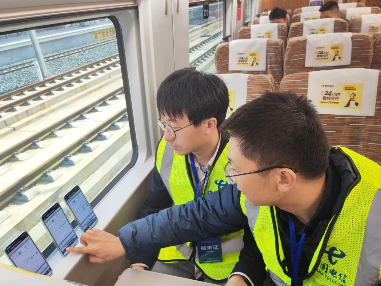 Network signals are tested on a train running on the Xi'an–Yan'an High-Speed Railway. (Photo: The Shaanxi branch of China Telecom)