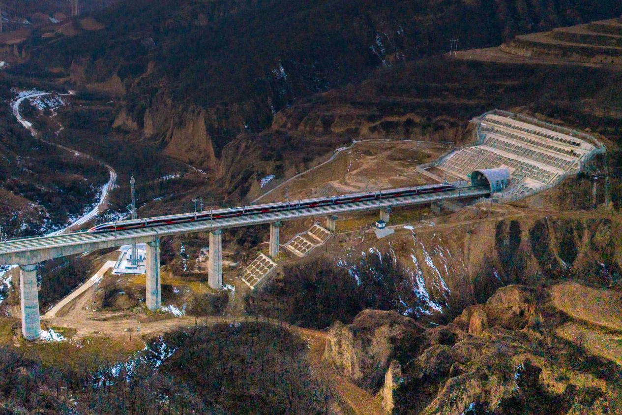 A Fuxing bullet train runs along the Luochuan-Fuxian section of the Xi'an–Yan'an High-Speed Railway, Dec. 26, 2025. (Photo: Liu Yijiang)