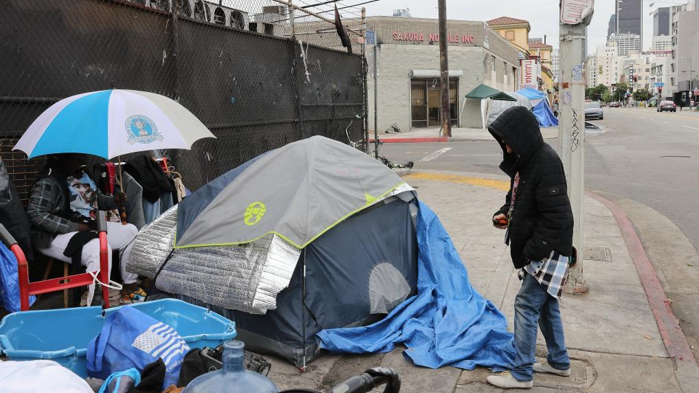 A homeless people is pictured on the sidewalk in downtown Los Angeles, California, the United States, December 31, 2025. (Photo: Xinhua)