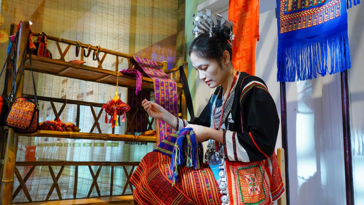 An inheritor of traditional Li textile techniques makes a piece of embroidery at the Chinese Traditional Culture Museum in Beijing. (Photo/Zhang Yongxin)