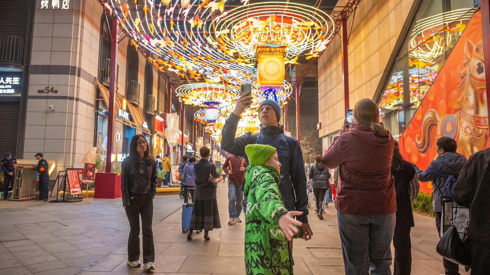 Foreign tourists walk along Qianmen Street, Beijing, China, March 21, 2026.