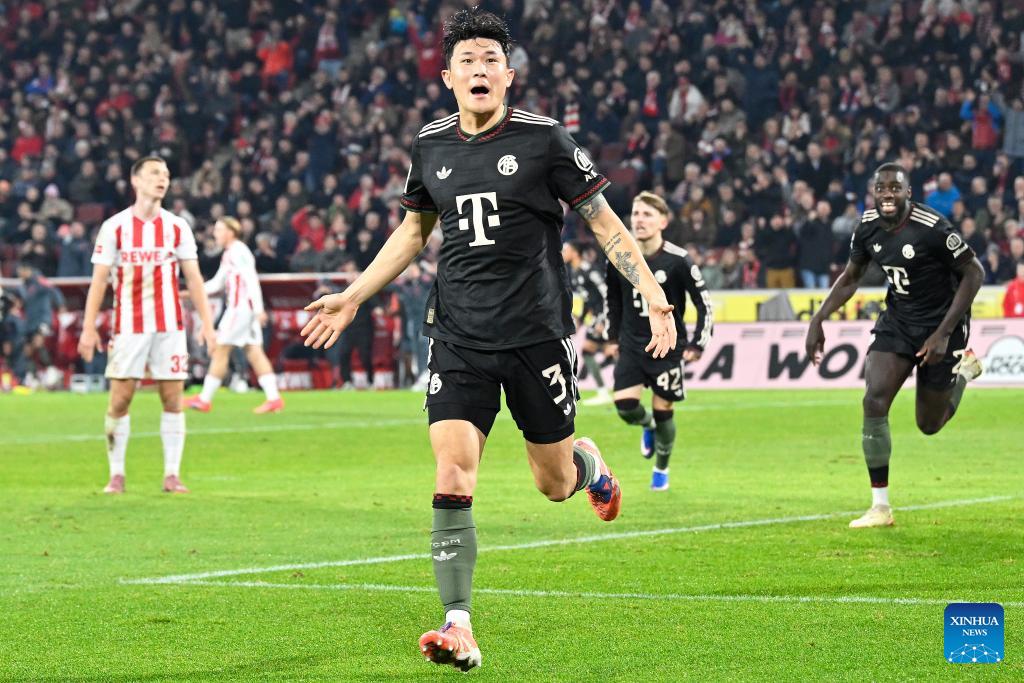 Kim Min-jae (front) of FC Bayern Munich celebrates scoring during the German first division Bundesliga football match between FC Cologne and FC Bayern Munich in Cologne, Germany, Jan. 14, 2026. (Photo by Ulrich Hufnagel/Xinhua)