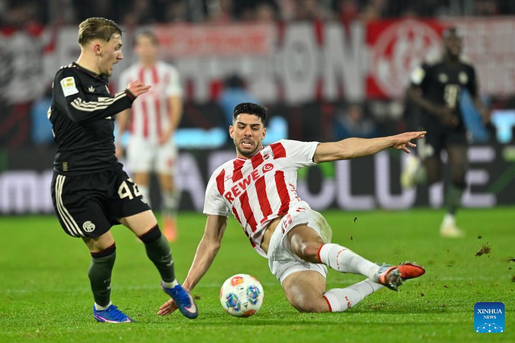 Lennart Karl (L) of FC Bayern Munich vies with Cenk Oezkacar of FC Cologne during the German first division Bundesliga football match between FC Cologne and FC Bayern Munich in Cologne, Germany, Jan. 14, 2026. (Photo by Ulrich Hufnagel/Xinhua)